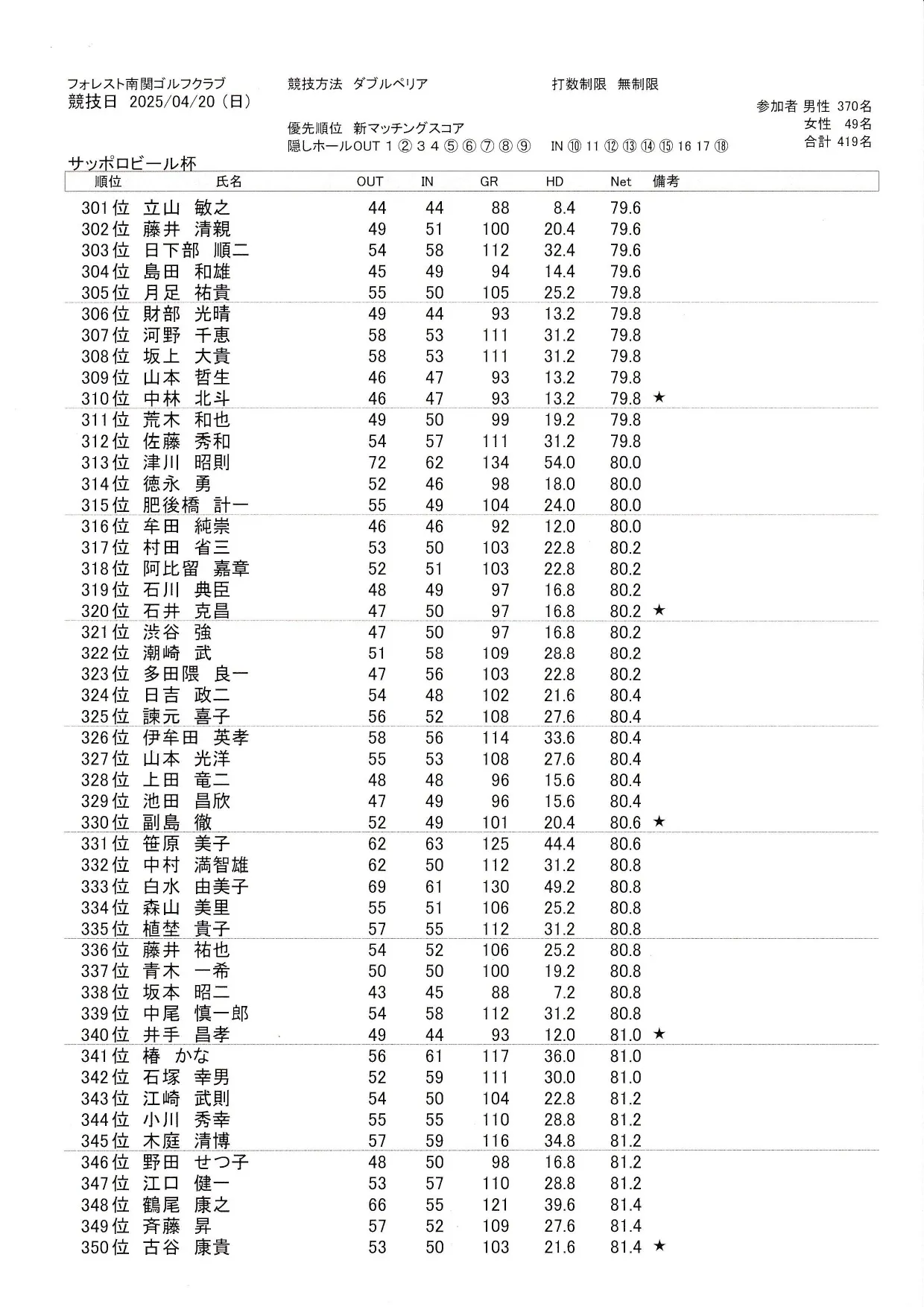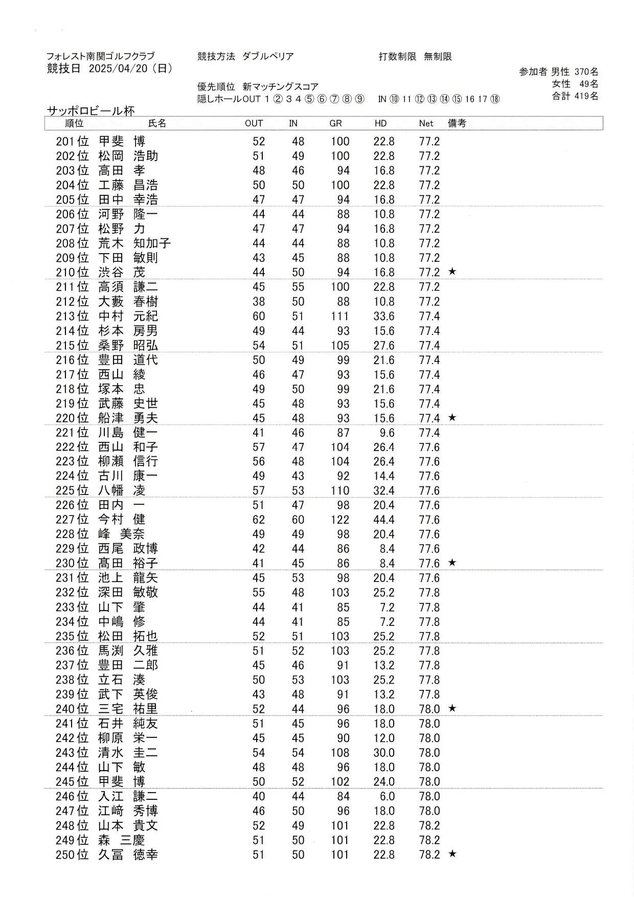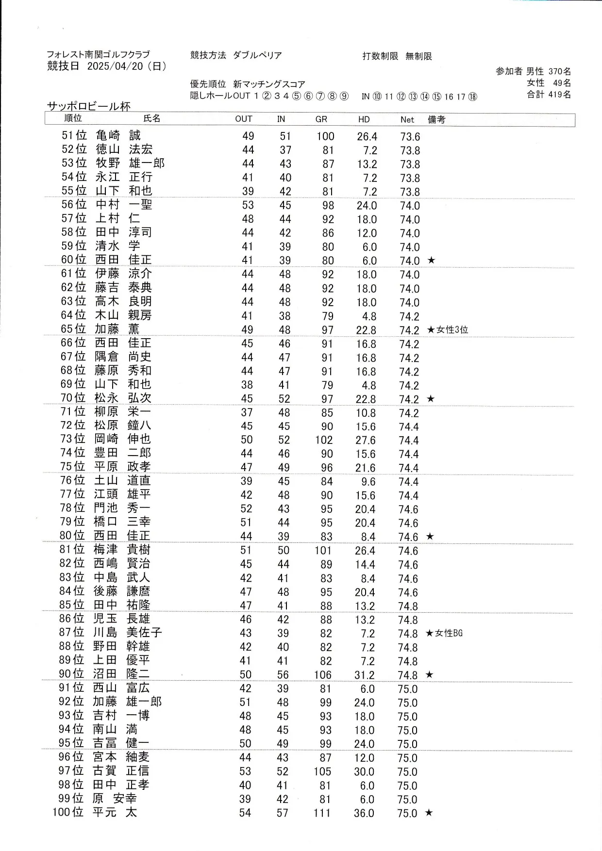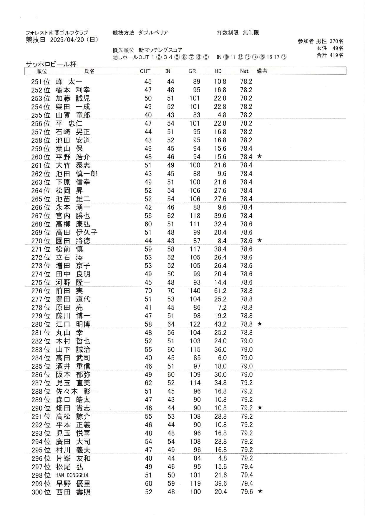 【4/8~20】サッポロビール杯成績 2025/04/21 【サッポロビール杯成績】R7.4月8日~20日開催 賞品が当選された方(★印)には順次ご連絡させて頂きます。 賞品の保管期間は3ヶ月となりますのでよろしくお願いいたします。