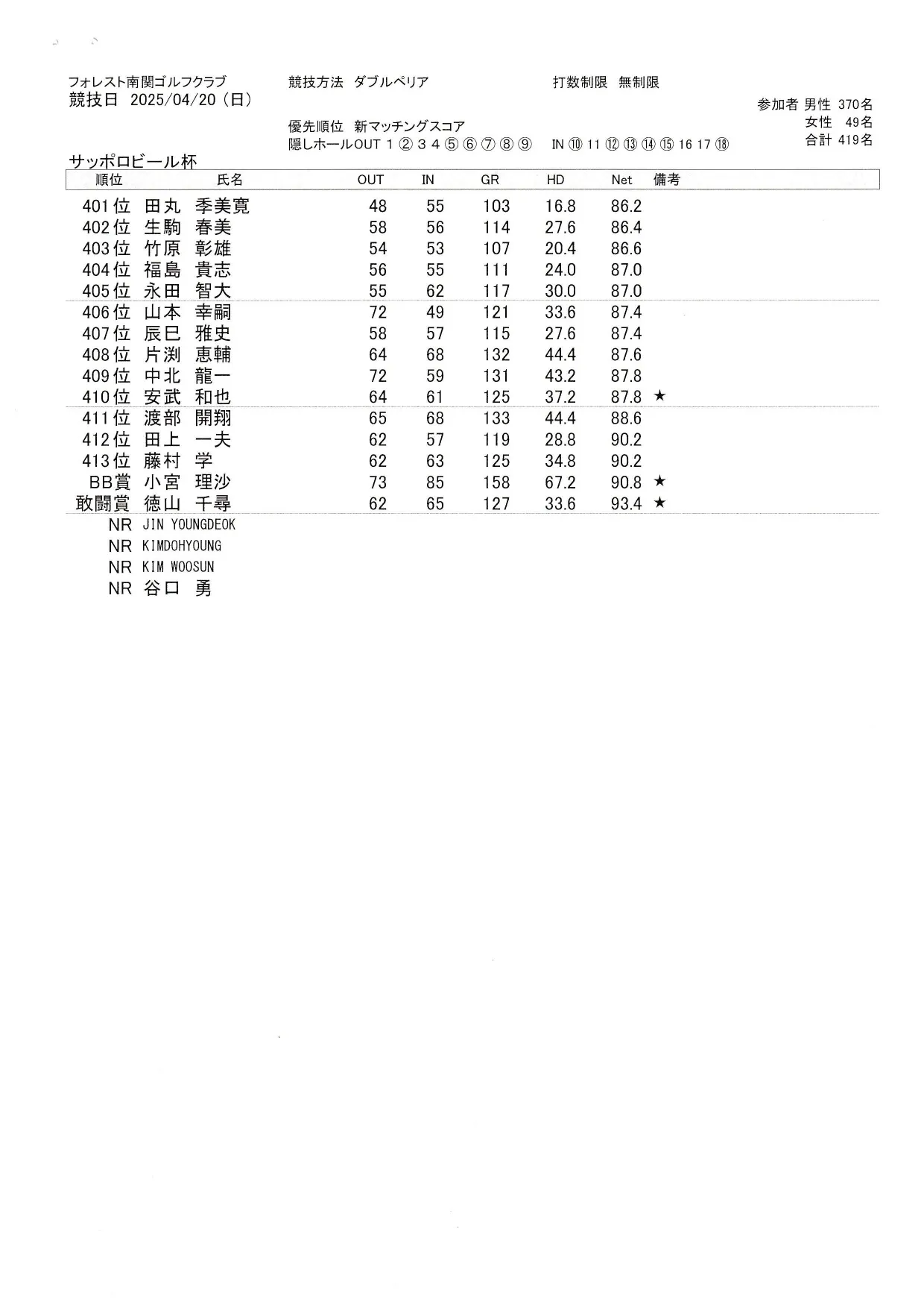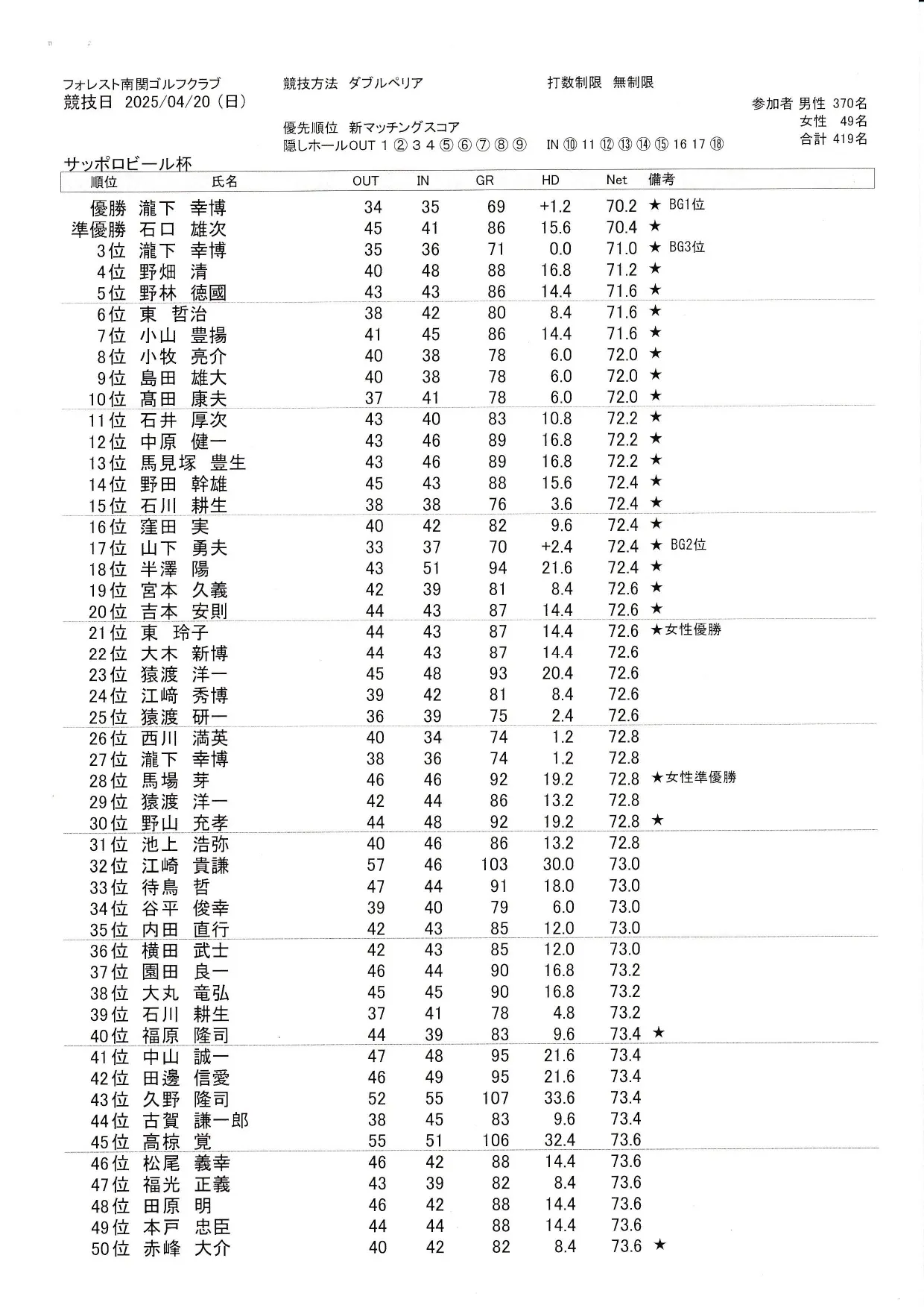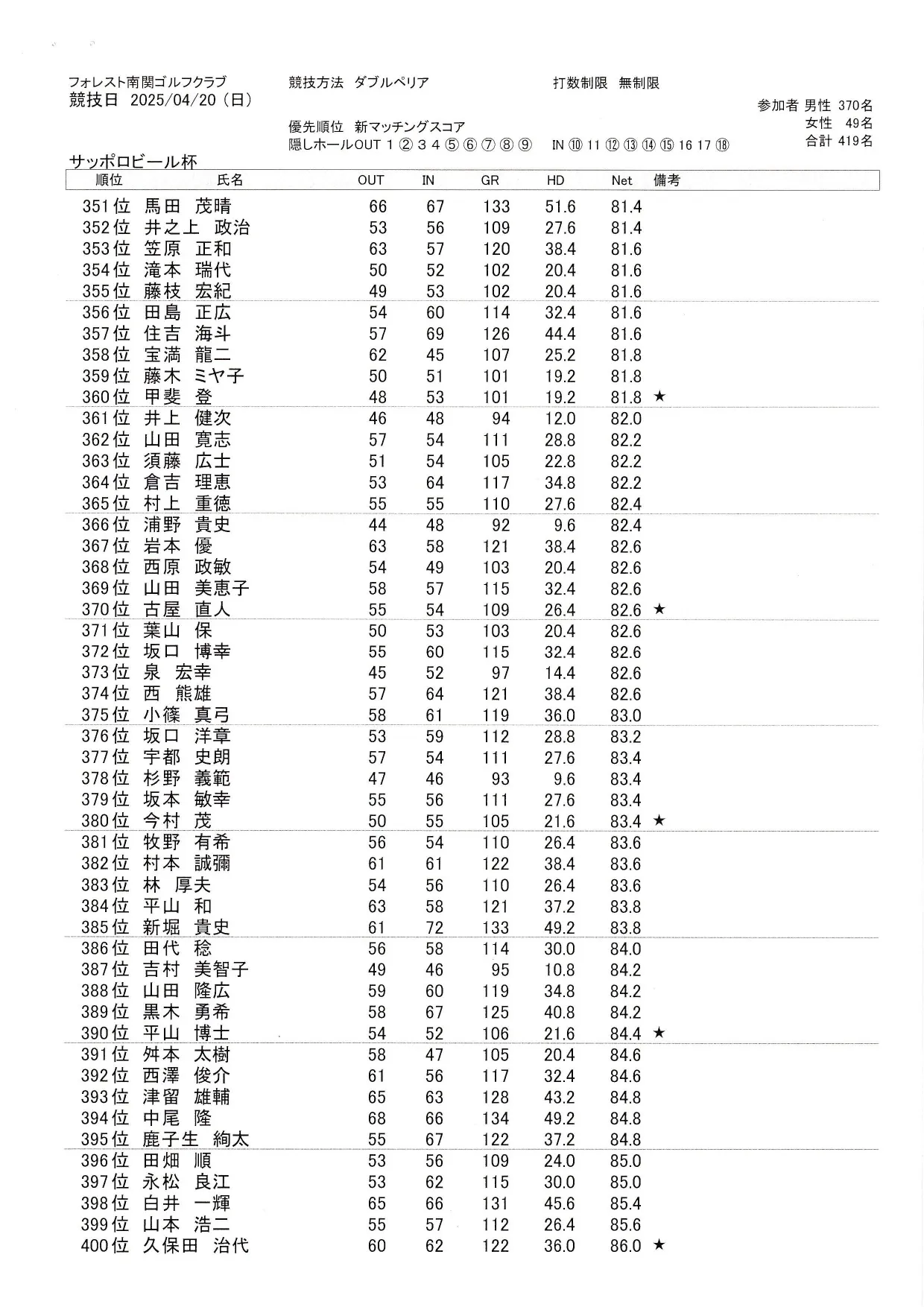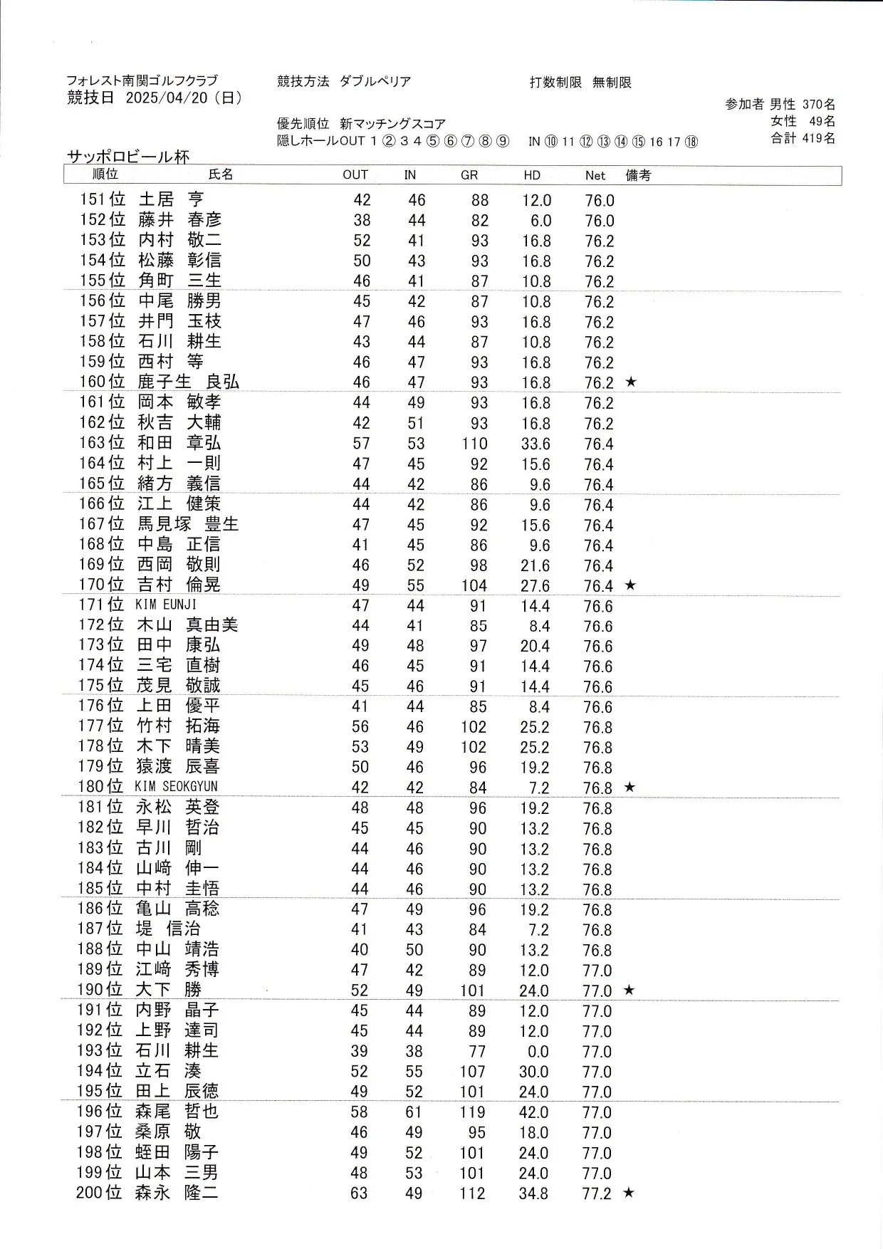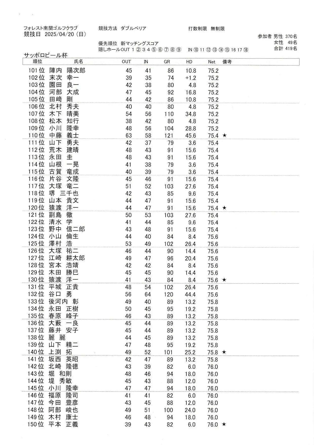 【4/8~20】サッポロビール杯成績 2025/04/21 【サッポロビール杯成績】R7.4月8日~20日開催 賞品が当選された方(★印)には順次ご連絡させて頂きます。 賞品の保管期間は3ヶ月となりますのでよろしくお願いいたします。
